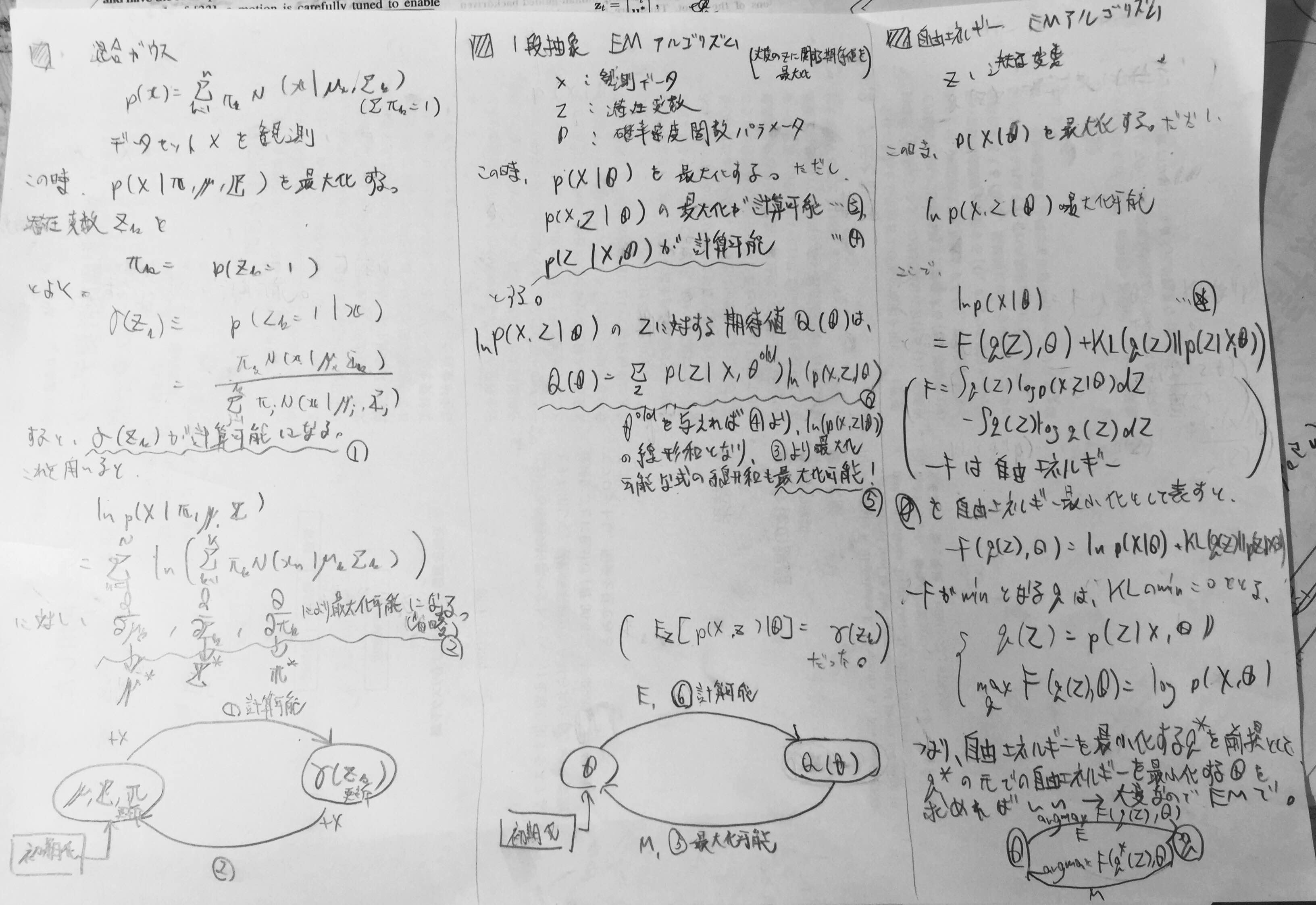 - 正確には、p(Z | X, θ)が計算可能かつp(X, Z| θ)が最大化可能ならば、p(X | θ)が繰り返し計算により局所最適化可能
