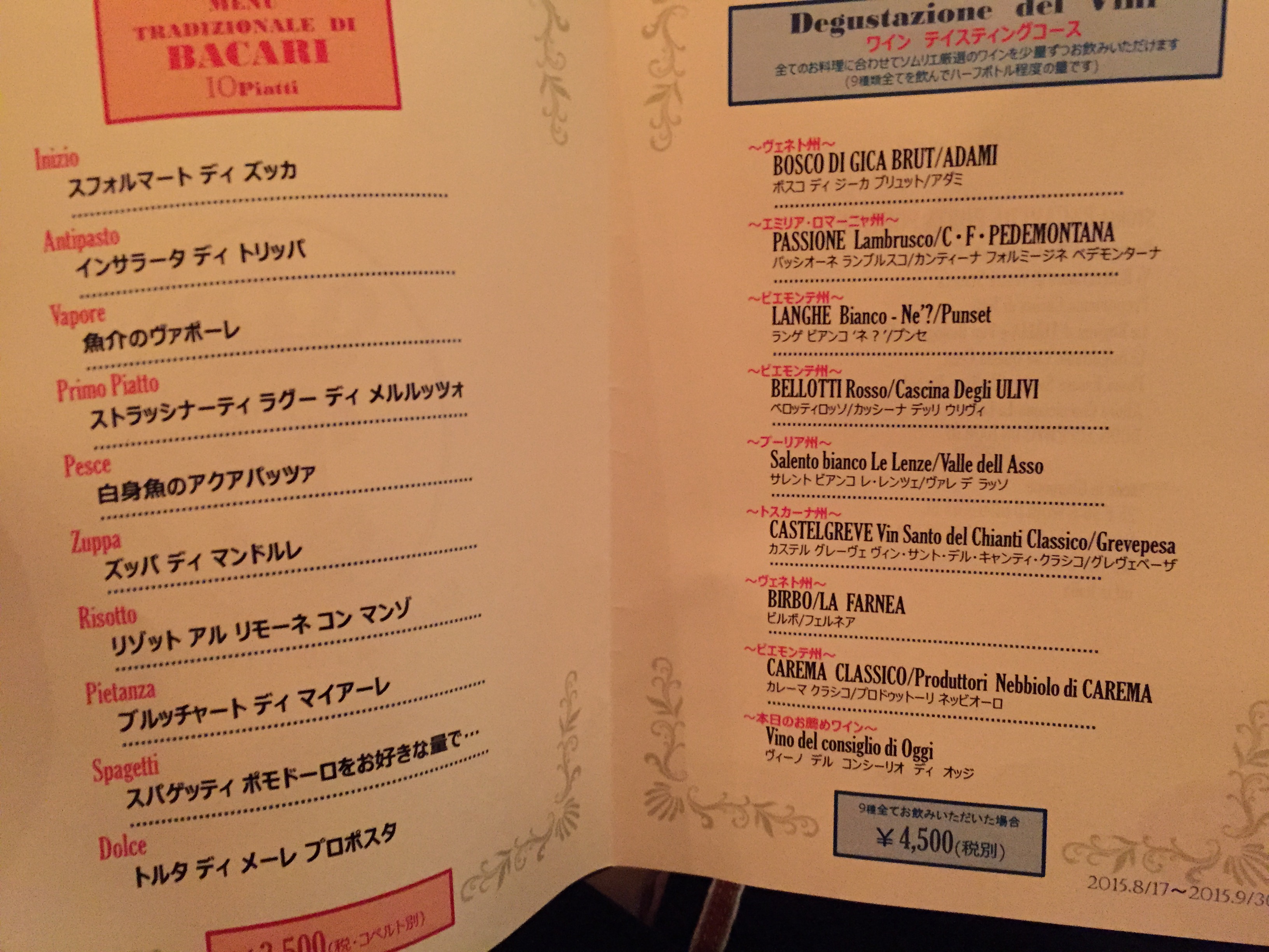 | 6 | コーヒー蜂蜜のソース、アーモンドスープゴルゴンゾーラ。ワインとゴルゴンゾーラがとても合う.北イタリアの伝統料理 | 干しぶどうのワイン、甘いデザートワイン |